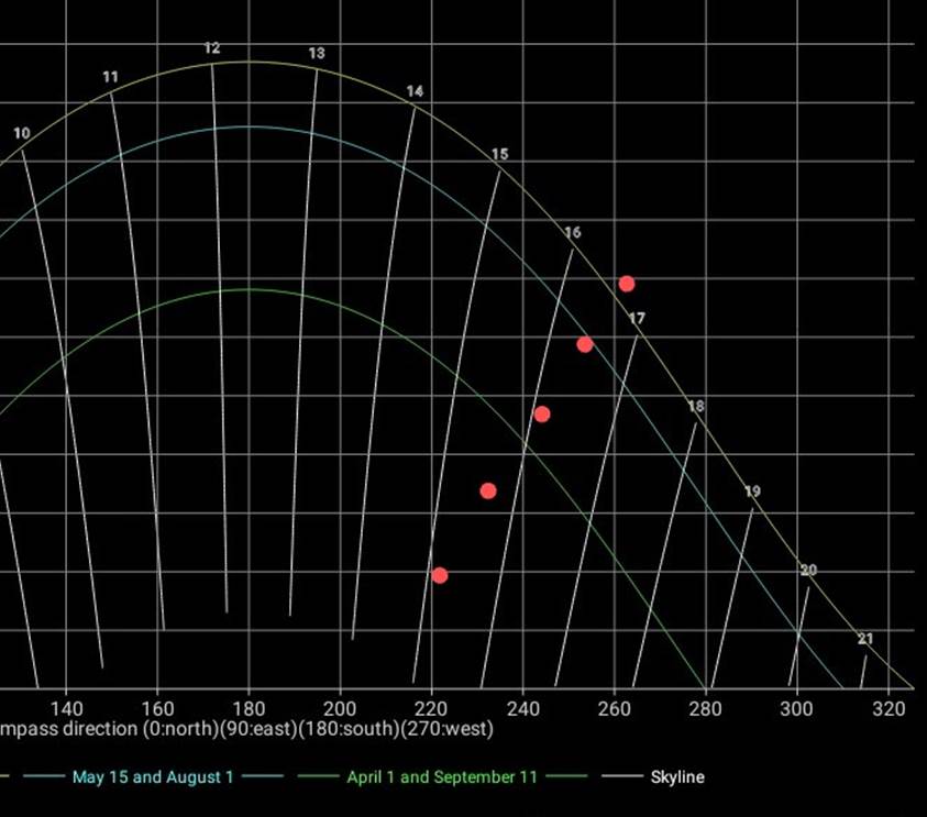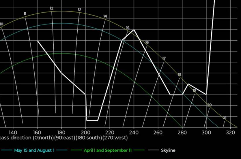 For et gitt sted viser gul, blå og grønn kurve solas høyde på himmelen gjennom dagen på ulike tidspunkter av året. Den kraftige, hvite streken viser vinkelhøyden for stedets ‘skyline’, dvs toppen av bygninger og trær sett fra ett middels bra beliggende bord på vedkommende sted.  Sola synes fra dette bordet når den er over ‘skyline’, ellers ikke.