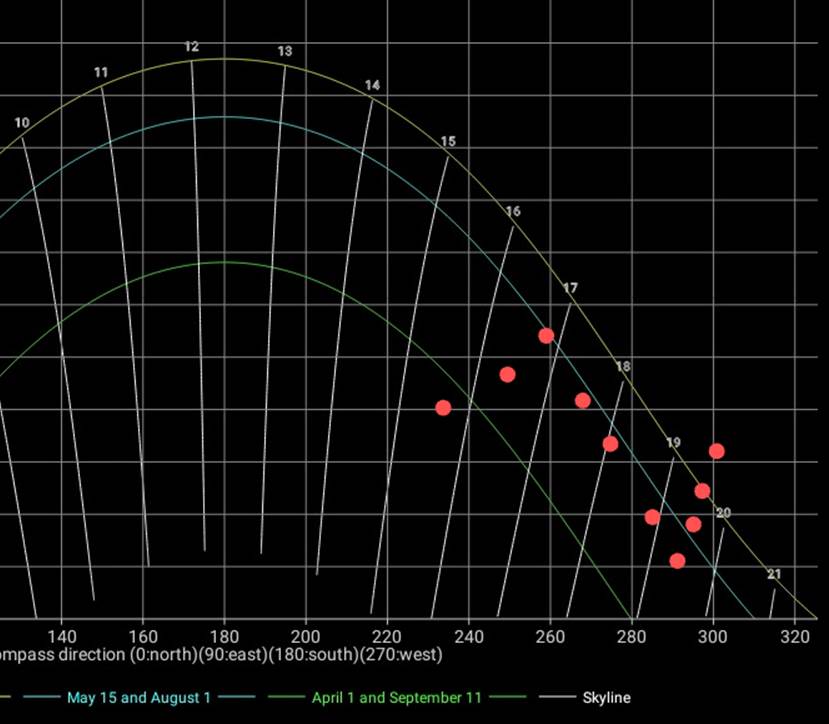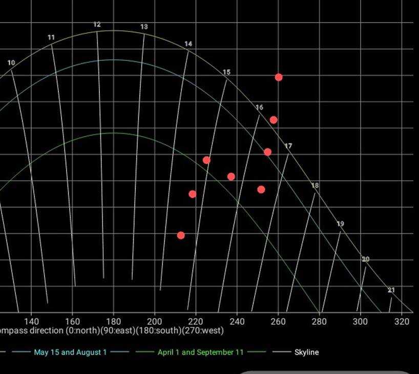bildet over viser et gløtt kl 1545 omkring St.Hans. En måned før og etter er det et solgløtt fra ca 1900 til 1930. Teddys softbar 16. mai 2024: