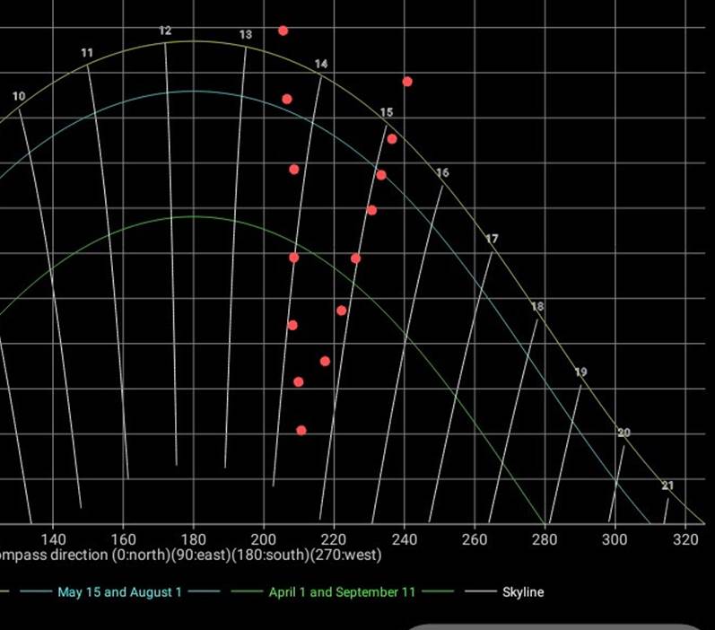 1/4 og 15/9 (grønn kurve) er det sol til ca 1345, dvs 1445 sommertid. Regn med feilmarginer på +/- en halv time, og vær klar over at andre