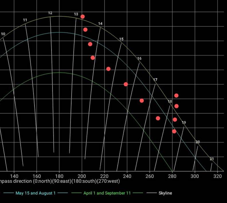 tynne, hvite stående linjene viser hvor mye klokka er når sola står i en