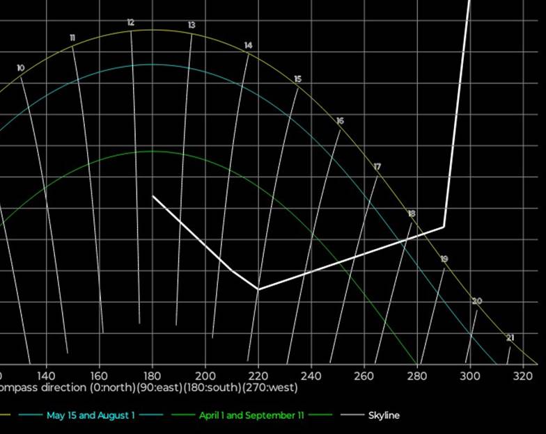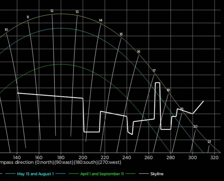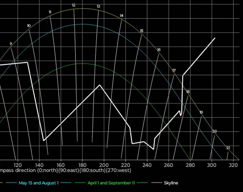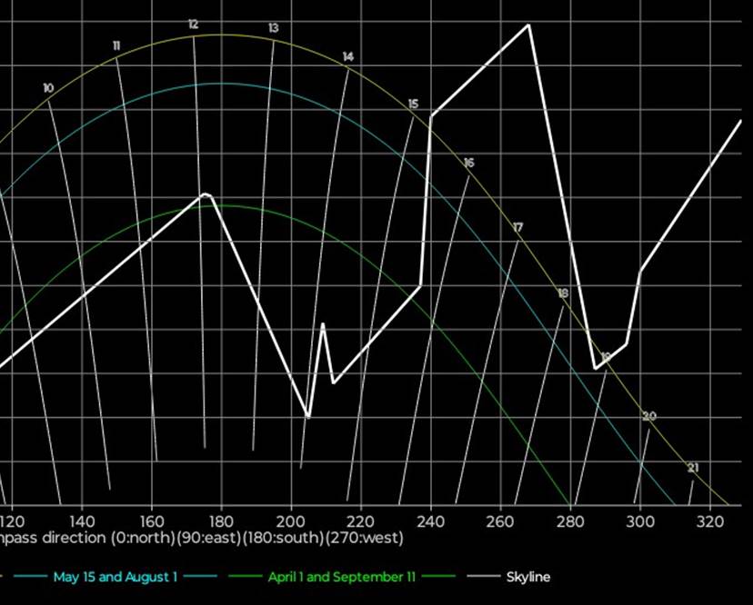 1/4 og 15/9 (grønn kurve) er det sol til ca 1345, dvs 1445 sommertid. Regn med feilmarginer på +/- en halv time, og vær klar over at andre