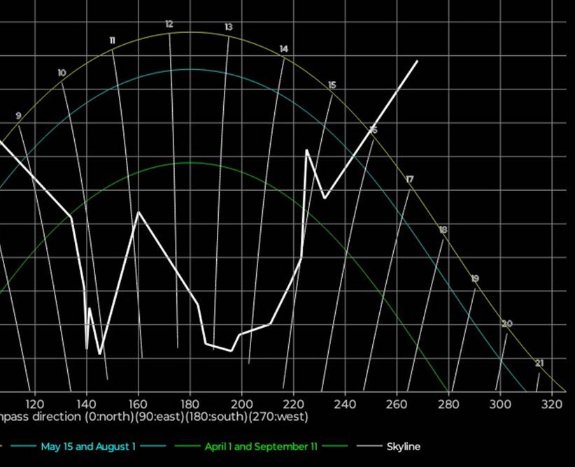 tynne, hvite stående linjene viser hvor mye klokka er når sola står i en