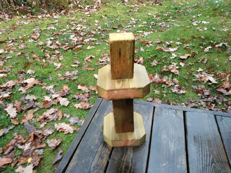 av impregnerte gjerdestolper skåret i skiver. I hver skive er det boret et sentrert,