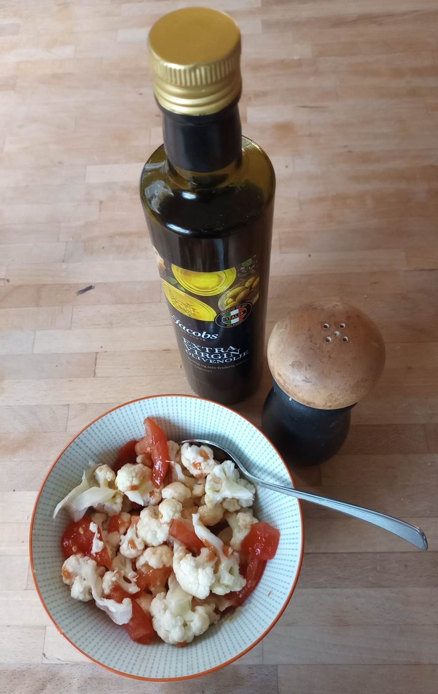 salt og litt olivenolje, gjerne iblandet oppskåren, lett sukret tomat. Jeg