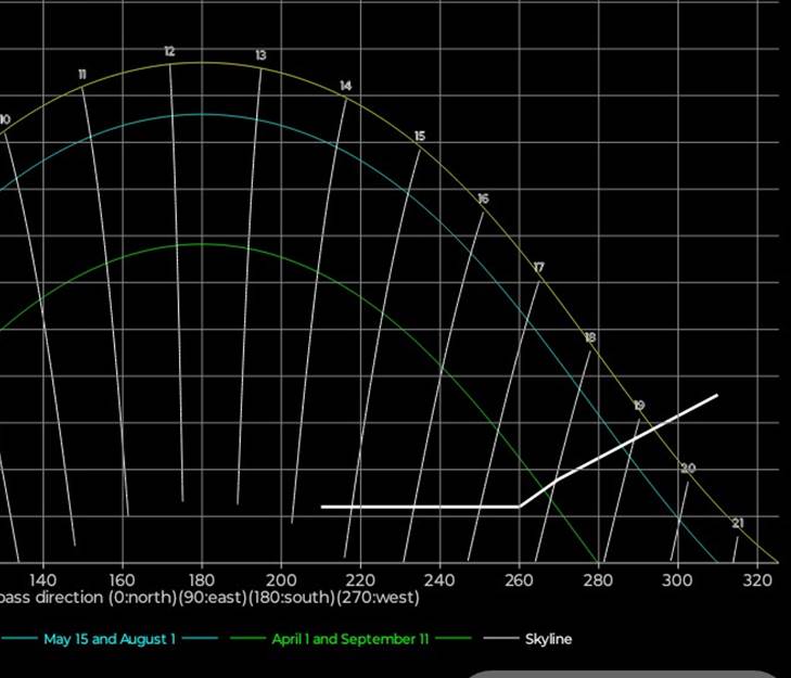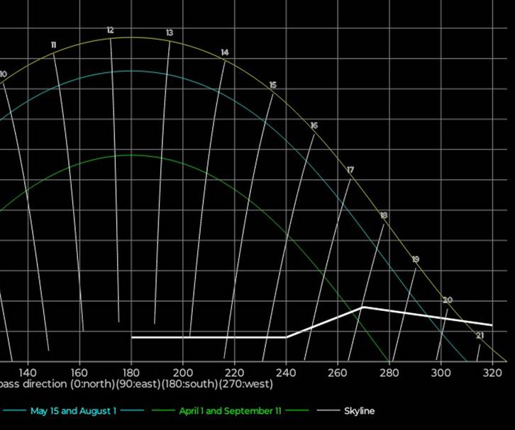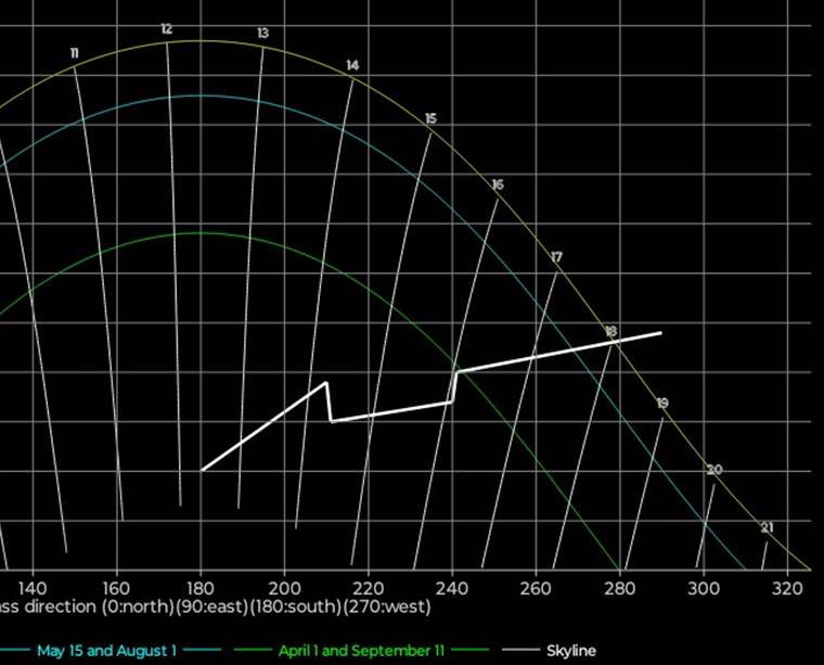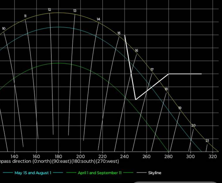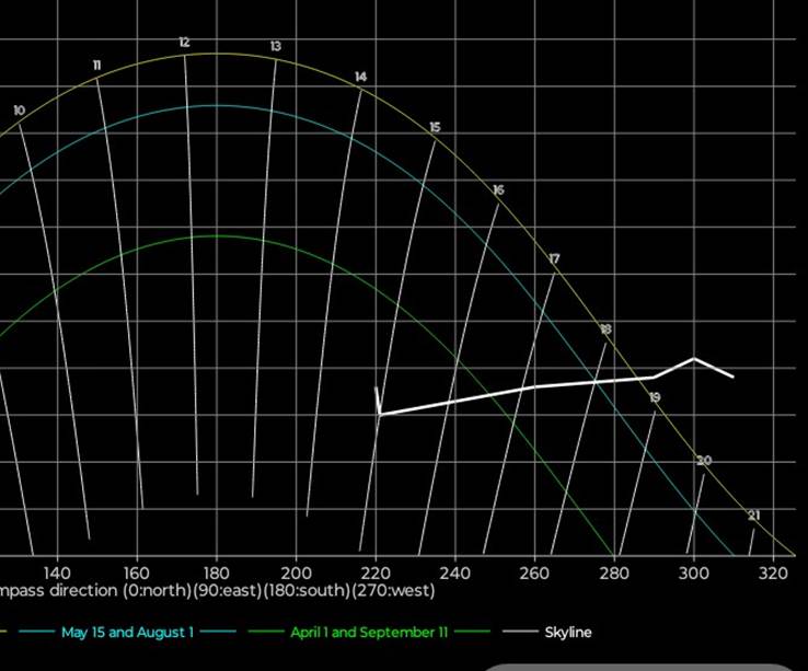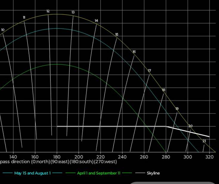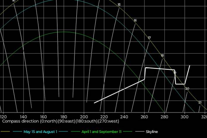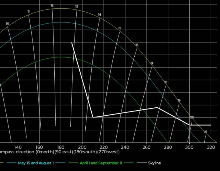 for stedets ‘skyline’, dvs toppen av bygninger og trær. Sola synes når den er over ‘skyline’,