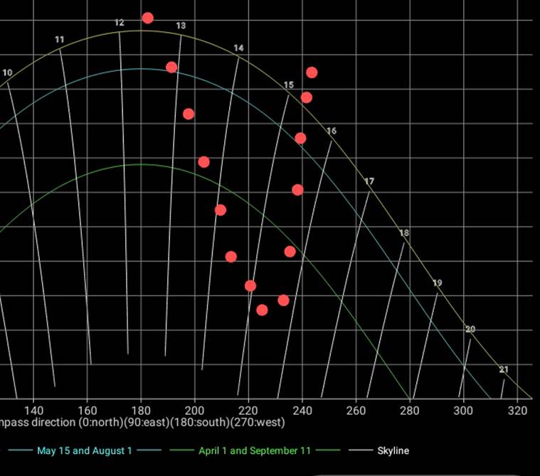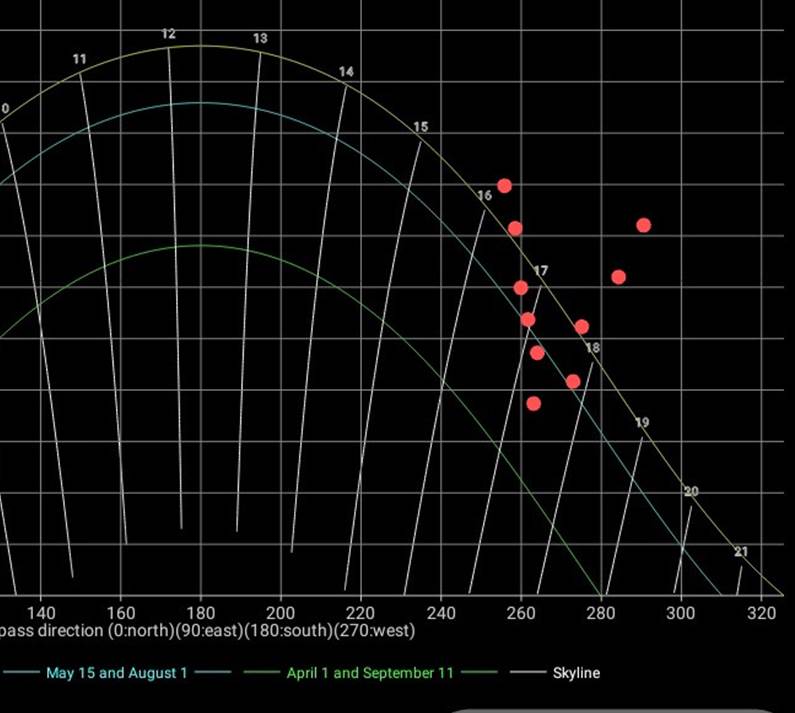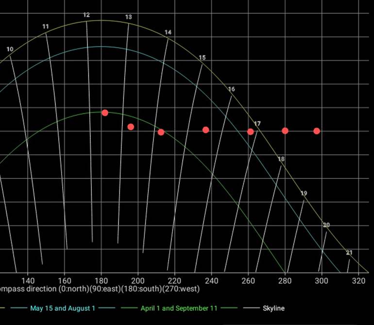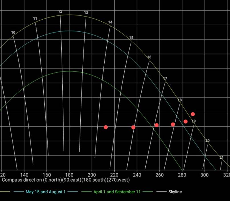 Røde prikker viser skyline. Brygg, kl 1625, like før stedet mister sola 22/6