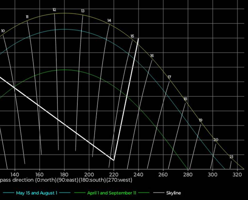 for stedets ‘skyline’, dvs toppen av bygninger og trær. Sola synes når den er over ‘skyline’,