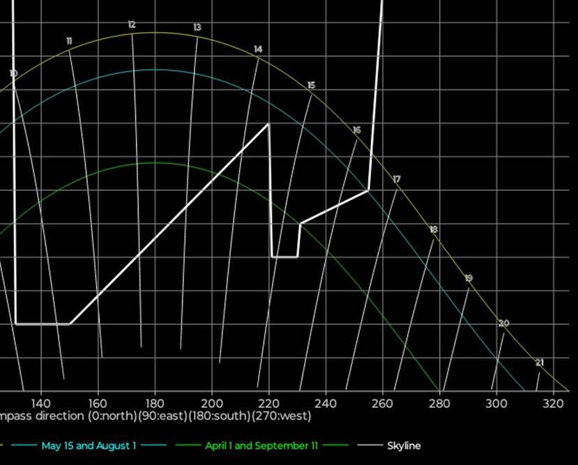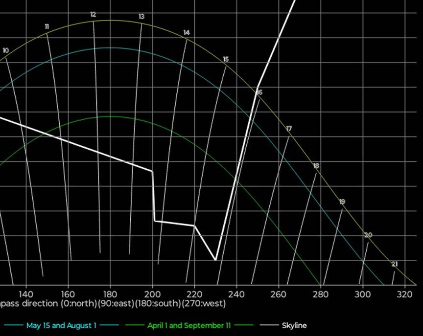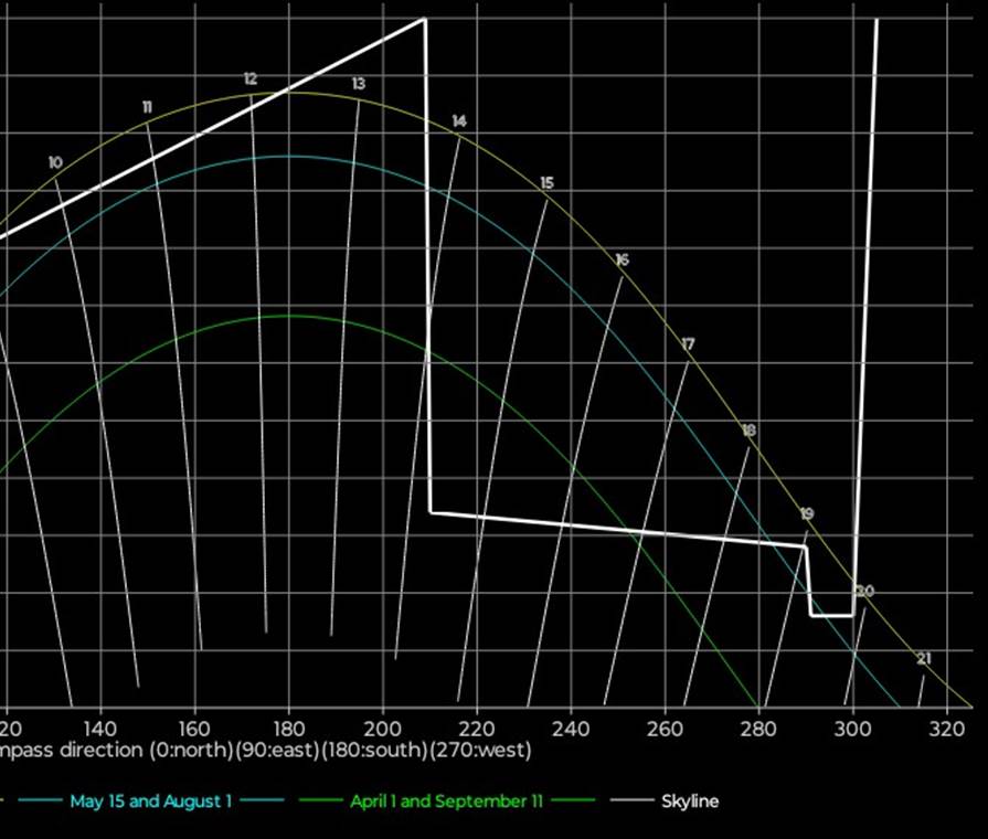 1/4 og 15/9 (grønn kurve) er det sol til ca 1345, dvs 1445 sommertid. Regn med feilmarginer på +/- en halv time, og vær klar over at andre