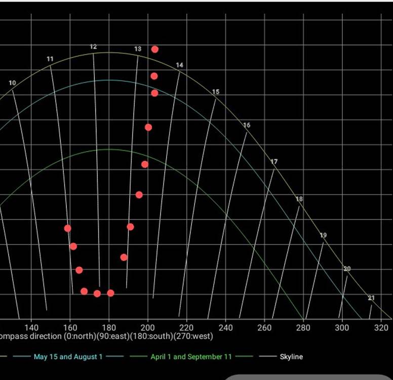 15/5 og 1/8 (blå kurve) er det sol til ca 1550, dvs 1650 sommertid. Omkring