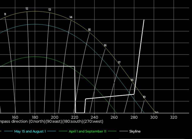 15/5 og 1/8 (blå kurve) er det sol til ca 1550, dvs 1650 sommertid. Omkring 1/4 og 15/9 (grønn kurve) er