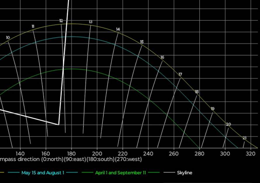 hvite stående linjene viser hvor mye klokka er når sola står i en bestemt