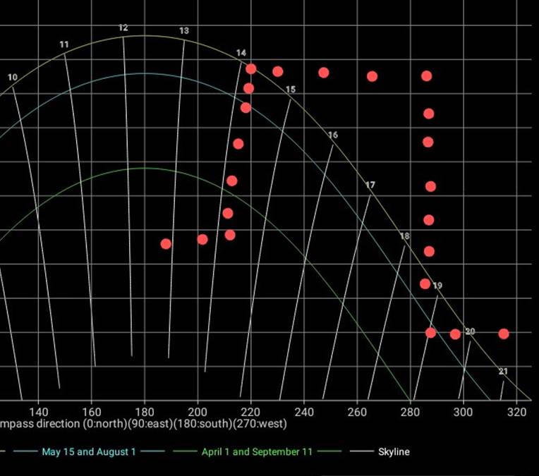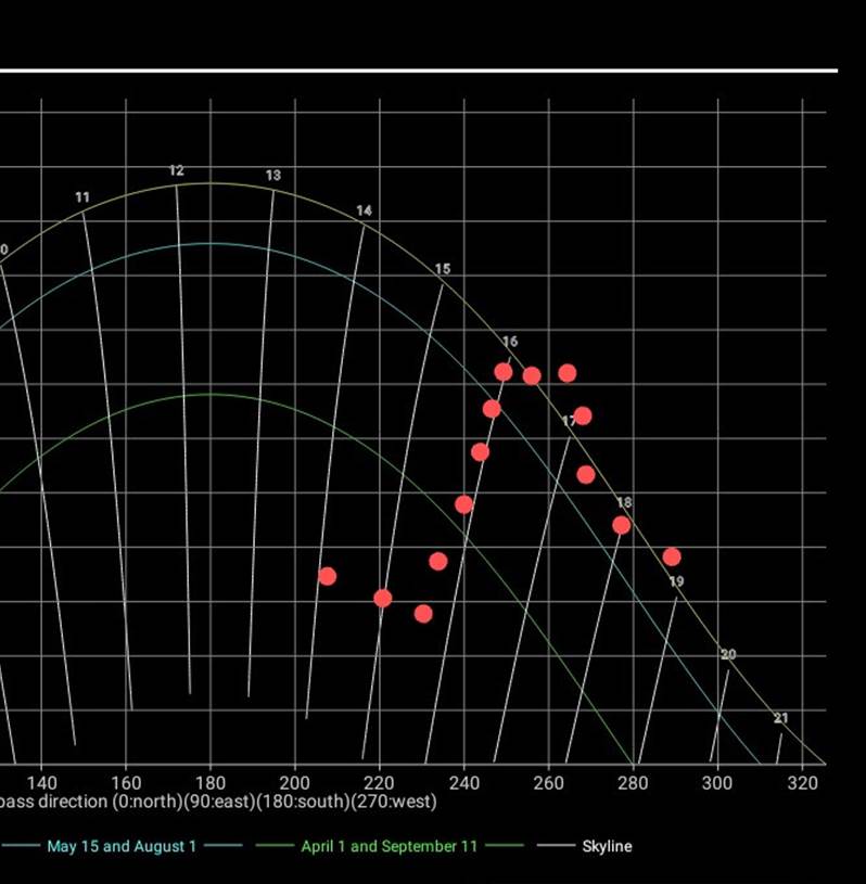 tynne, hvite stående linjene viser hvor mye klokka er når sola står i en