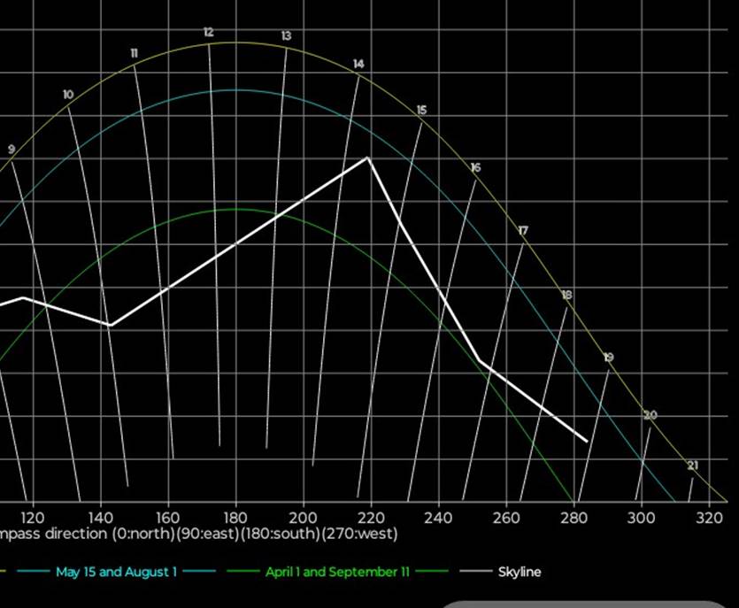 1/4 og 15/9 (grønn kurve) er det sol til ca 1345, dvs 1445 sommertid. Regn med feilmarginer på +/- en halv time, og vær klar over at andre
