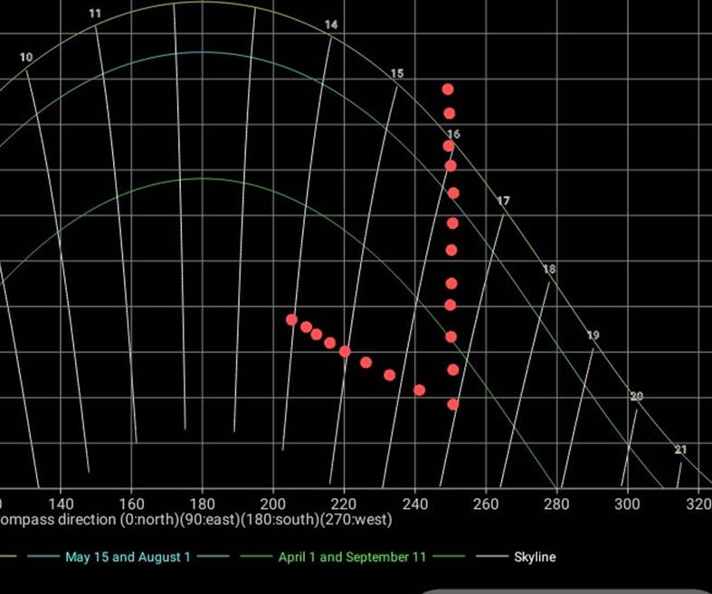 15/5 og 1/8 (blå kurve) er det sol til ca 1550, dvs 1650 sommertid. Omkring
