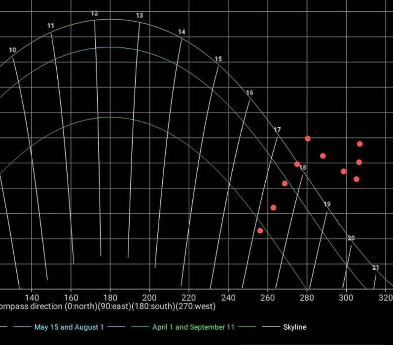 tynne, hvite stående linjene viser hvor mye klokka er når sola står i en